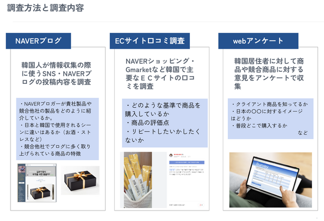 韓国居住者に対して商品や競合商品に対する意見をアンケートで収集