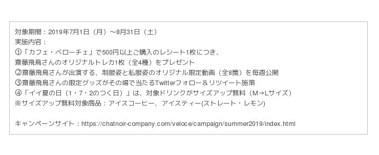 株式会社シャノアール(本社/東京都豊島区、代表取締役社長/中村成佑)は、人気アイドルグループ・乃木坂46で活躍する齋藤飛鳥さんを起用した「ベローチェでSUMMER」キャンペーンを、全国の「カフェ・ベローチェ」にて、2019年7月1日(月)より実施いたします。