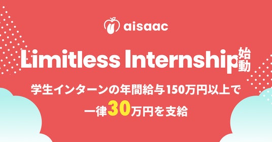 アイザック株式会社(東京都渋谷区、代表取締役社長 田中 和希、以下アイザック)は、学生インターンに支払う年間給与が150万円を超える場合に、30万円を追加支給する「Limitless Internship(リミットレスインターンシップ)」を発表しました。本制度の実施により、所得が増えることによる、学生や扶養している家族の経済的負担を軽減し、学生とスタートアップの「成長の壁」を取り払うことを目指します。