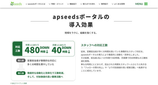 また、主要なサービスページにおいては、導入によってどのような課題解決が可能かを示す「導入効果」のコンテンツを追加しています。今後、多様な業界・規模の事例を順次拡充していくことで、導入後の変化をより鮮明にイメージいただける情報発信を行ってまいります。