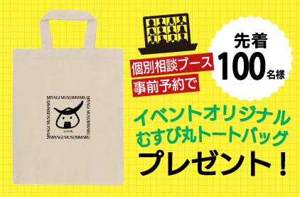 移住や仕事の相談ができる個別相談ブースを予約した方には、先着100名様に「むすび丸トートバッグ」をプレゼント!