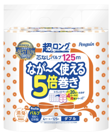 丸富製紙株式会社(本社:静岡県富士市、代表取締役社長:佐野武男、以下当社)は、超長尺芯なしトイレットペーパー「ペンギン 超ロング パルプ 5倍巻き 4ロール ダブル(MONOQLO限定パッケージ)」を、期間限定で2022年4月に新発売いたします。