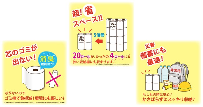 通常20ロールがたった4ロールのボリュームに収まるため、保管スペースに余裕が生まれます。