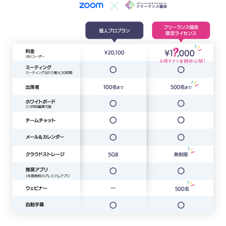 フリーランス協会限定Zoomライセンスは、個人向けプロプランのミーティング出席可能人数やストレージ容量などがアップグレードされているほか、ウェビナー機能の追加など、通常は法人契約のみでしか利用できない機能が追加された、大変お得なプランです。