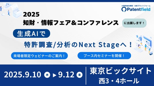 『AI特許総合検索・分析プラットフォーム Patentfield』を展開するPatentfield株式会社(本社:京都市中京区、共同CEO:村上直也、石津孝祐)は、2025年9月10日(水)から12日(金)に開催される「2025知財・情報フェア&コンファレンス」に出展します。
