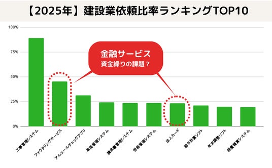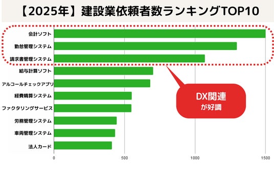 依頼数ランキングにも登場する「ファクタリングサービス」「アルコールチェックアプリ」「車両管理システム」「請求書管理システム」「法人カード」などのサービスは、建設業依頼比率ランキングでも高順位にランクインしており、建設業に特に求められるサービスであることが分かります。