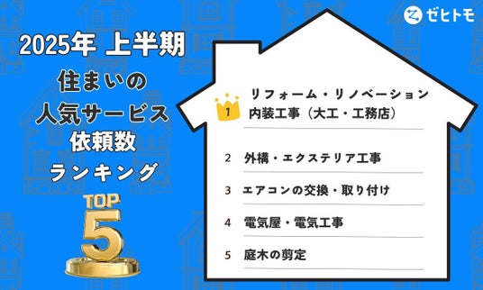 株式会社Zehitomo(本社:東京都品川区、代表取締役:三浦雄一郎)が運営する、くらしのマッチングサービス「ゼヒトモ」は、2025年4月~9月の依頼データを集計し、「住まい関連サービス依頼数ランキングTOP5」を発表しました。