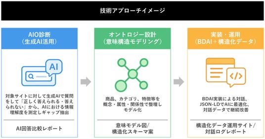 本プロジェクトでは、生成AIを活用したAIO(AI Optimization)診断と、当社らが研究を進め「ISWC 2025 Challenge Track(※1)」に採択された論文のオントロジー(※2)による意味構造モデリングの実務応用、またBrand Dialogue AI(以下、BDAI)(※3)の実装による対話データを蓄積。これらをAIに最適化して活用することで、AIと人の双方に「見つけられ・選ばれる」Webサイトを実現いたします。