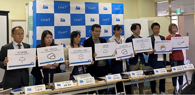 【5月21日、広島市】G7広島サミットの最終日となる21日、広島市青少年センターでエンゲージメントグループのひとつ「Civil Society7」(市民社会、C7)が記者会見を実施、20日に発表されたG7首脳宣言および関連する声明を含め、G7広島サミットの成果について、市民社会としての評価を実施し、6つの分野別課題と全体について、「晴れ」「曇り時々晴れ」「曇り」「雨」「土砂降り」の5段階で評価し、「核廃絶」雨/「気候・環境」曇り/「経済」土砂降り/「国際保健」雨/「人道支援」曇り/「しなやかで開かれた社会」土砂降り/「広島市民社会としての評価」曇り時々晴れ/「全体総括」雨との評価を発表しました。