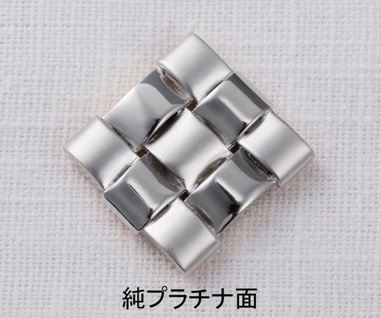 今回新たに投入する新作「バスケットウィーブ」ペンダントトップは、既存のK18/Pt900のリバーシブルペンダントを、純度を上げ純プラチナと純金に変更したリバーシブル仕様です。