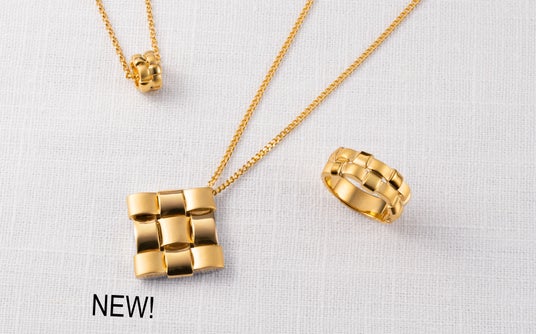 「バスケットウィーブ」シリーズは素材の表面に鏡面加工とマット加工を交互に施し、バスケットの編み込み模様を思わせるデザインが特徴です。その洗練されたクラス感や独特の存在感などから、発売開始後20年以上を経て、ギンザタナカのロングセラーアイテムのひとつになっています。昨今の純金ジュエリーに対する需要の高まりを受けて、人気の「バスケットウィーブ」シリーズに純金仕様のアイテムを拡充し、好評販売中です。