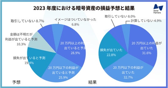 「2023年度における、ご自身の暗号資産関連の損益状況について、詳細な計算を行う前からおおよその把握をしていましたか?」という設問、そして「2023年度の取引における、実際の暗号資産関連の損益計算結果について教えてください。」という設問では、多数の回答者が「認識・予測通り」の結果となっているものの、約13.7%(※1)の回答者は「認識・予測と異なっていた」という結果になりました。