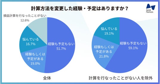 損益計算を行なった内の各20%前後が計算方法の変更経験あり、もしくは変更を悩んでいる