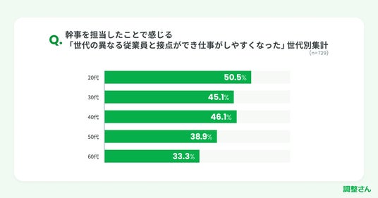 上記の質問で「世代の異なる従業員と接点ができ仕事がしやすくなった」と答えた人を、世代別で集計しました。その結果、20代が50.5%となり、最も割合が多いことがわかりました。2番目は40代で、この世代の幹事経験者の46.1%が、世代の異なる従業員との接点をメリットと感じていることが示されました。