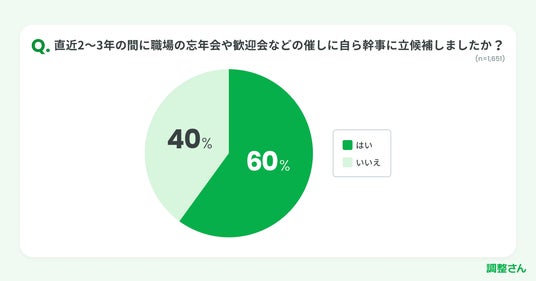直近2~3年の間に職場の忘年会や歓迎会などの催しで幹事を経験した人に対し、自ら幹事に立候補したかどうかを聞くと、全体の60%が「はい」と答え、過半数以上が率先して幹事を担当していることがわかりました。