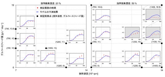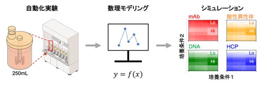 - モノクローナル抗体製造の培養工程に関して、自動化実験で得たデータから、目的生成物や不純物の濃度を、広範な培養条件で精度良く予測できる新規数理モデルを構築しました。