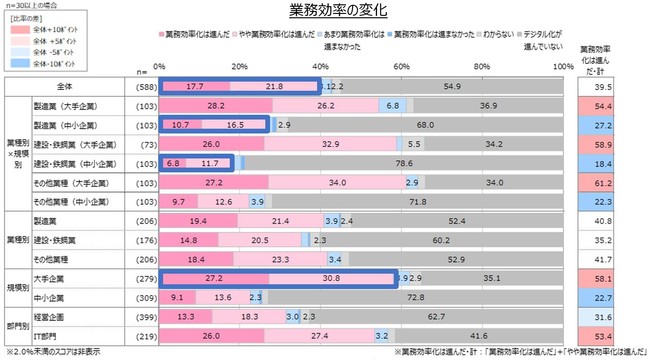 デジタル化による業務効率化は他の成果項目より進んでいますが、全体でもわずか39.5 %と半数にも及ばず、中小企業に絞ると製造業で27.2%、建設・鉄鋼業では18.4%と平均を下回る結果となっています。一方で大企業全体では約6割(58.1%)がDXによる業務効率の変化を実感しています。