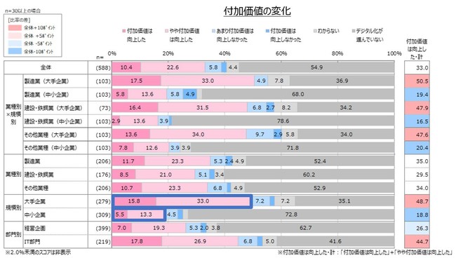 日本企業でデジタル化が進んでいることが明らかになったにもかかわらず、必ずしも業務変革や新しいサービスの創出にはつながっていないことがわかっています。デジタル化が進むことで事業構造の変革につながったおよび自社のサービス等の付加価値が向上したと実感しているのは全体でわずか3割程度(事業構造の変化:32%、付加価値の変化:33%)に留まっています。大手企業の48.7%で付加価値が向上したと回答する一方、中小企業は20%未満と大手企業の半数を下回っています。