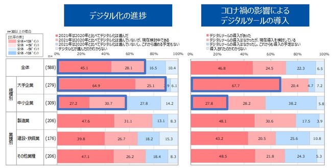 パンデミック以降DXが加速、大手企業の9割、中小企業でも約6割がデジタル化の進捗に前向き