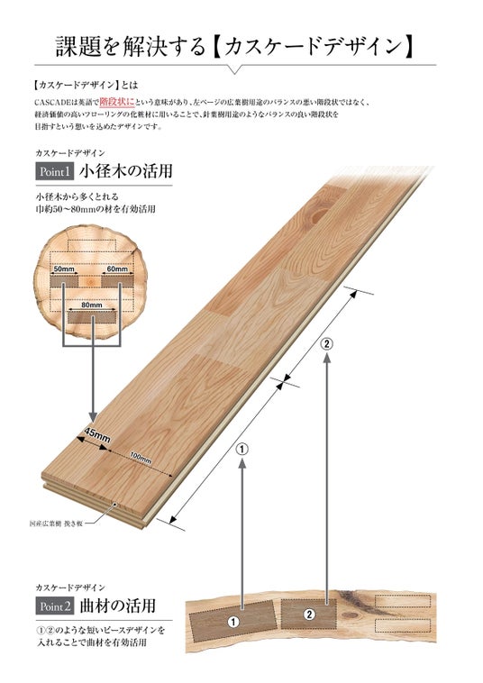 希少な国産広葉樹の魅力と土足環境に適した機能性を兼ね備えた製品とすることで、店舗や施設の内装に、杉・桧とは異なる意匠の国産材フローリングを提供します。また、活用が難しい小径木を使用することで国産広葉樹の価値を高め、持続可能な森林経営や木材生産を行う地域の活性化、日本の里山の豊かな自然の保護にも貢献します。