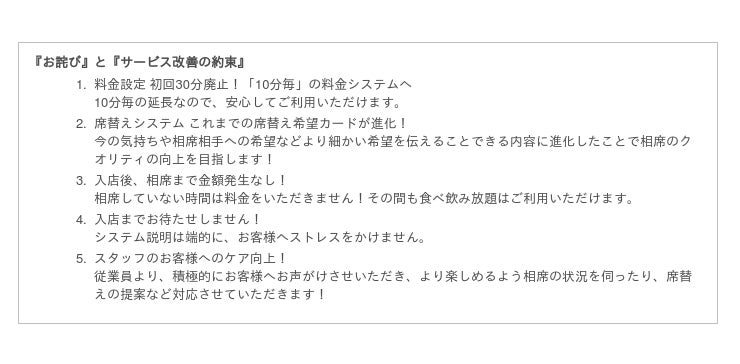 今年7月に5周年を迎え、開業から現在までの累計マッチング数は、約530万マッチング(2019年9月現在)にものぼります。開店当初は接客のノウハウやマニュアルもなく、混み合う店内で全てのお客様へ満足いただくサービスの提供ができでなかったことを5周年を迎えた節目に社員一同、今までのお客様へ『お詫び』と『サービス改善の約束』をここに誓います。