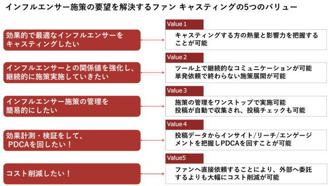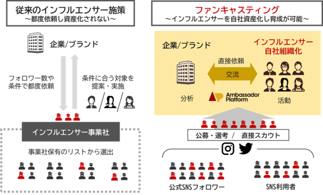 一方で「ファン キャスティング」では、ファンの中からインフルエンサーになっていただくことから、信頼性の高い投稿内容の醸成が可能となります。