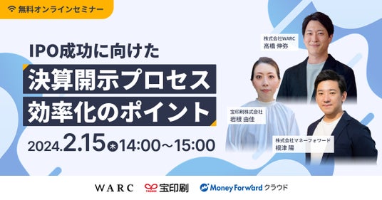 成長企業の経営管理支援事業を展開する株式会社WARC(本社:東京都品川区、代表取締役社長: 山本 彰彦、以下「WARC」)は、宝印刷株式会社(本社: 東京都豊島区、代表取締役社長:堆 誠一郎、以下「宝印刷」)、株式会社マネーフォワード(本社: 東京都港区、代表取締役社長CEO:辻 庸介、以下「マネーフォワード」)と「IPO成功に向けた決算開示プロセス効率化のポイント」をテーマとしたオンラインセミナーを共催することをお知らせします。