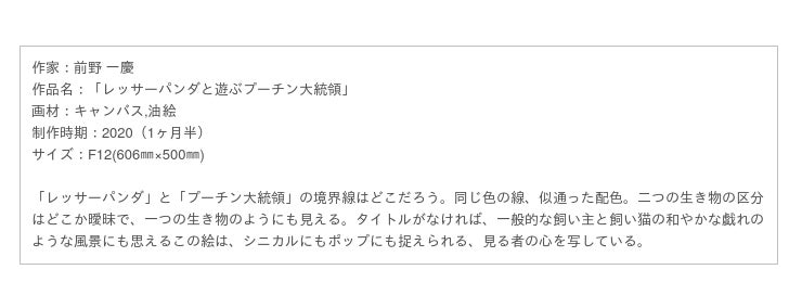展示している「レッサーパンダと遊ぶプーチン大統領」は、急にイメージがわいてきて、描きあげました。大勢の方に見てもらいたいです。