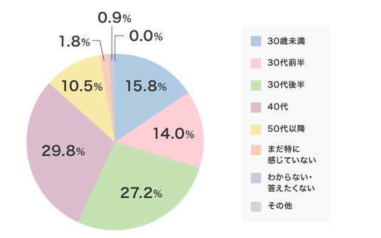 体型変化を実感した年代を聞いてみたところ、30代後半から40代の合計が半数を大きくこえました。