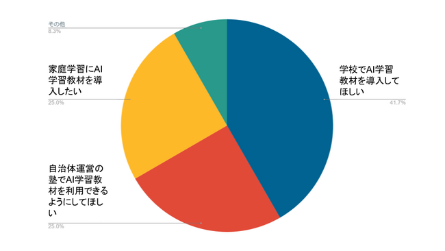 【4.】保護者 AIを活用した個別最適な学びに対する希望:「学校でAI学習教材を導入してほしい」が最多であり、次いで「自治体運営の塾でAI学習教材を利用できるようにしてほしい」、「家庭学習にAI学習教材を導入したい」が上げられている