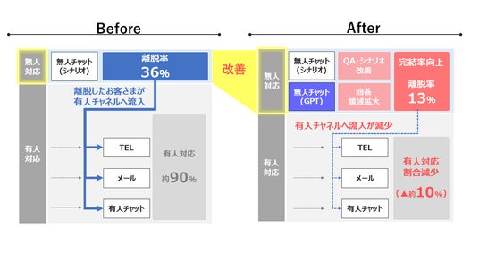 本プロジェクトを通して、各有人対応チャネルから無人チャネルへの導線を見直し、お客さまご自身で問題解決できるお問い合わせについては、無人チャネルへと適切に誘導しました。既存のシナリオ型チャットボットで利用しているQAを追加・修正することで、離脱率を約1/3に減少することに成功。さらに、生成AI型チャットボットの追加により、ユーザーの多様な質問に柔軟に対応できるよう、より実用的な情報提供を強化しました。