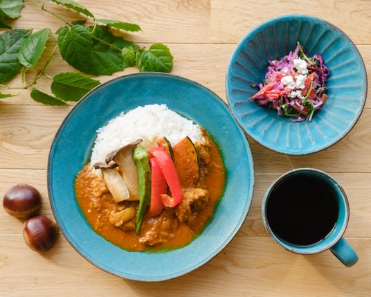 自家製スパイスカリーとパウンドケーキです。独自で調合したスパイスを使い、無農薬栽培の焼き野菜を添えた滋味深い味わいの「季節野菜と鶏肉のスパイスカリー」が定番です。お米はグループ内法人の株式会社南魚沼生産組合が作る新潟県南魚沼産、減農薬栽培のコシヒカリを使っています。