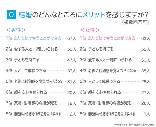 既婚男女200人に結婚のメリットは何かと質問したところ、男女ともに「2人で助け合うことができる」という回答が最多でした。