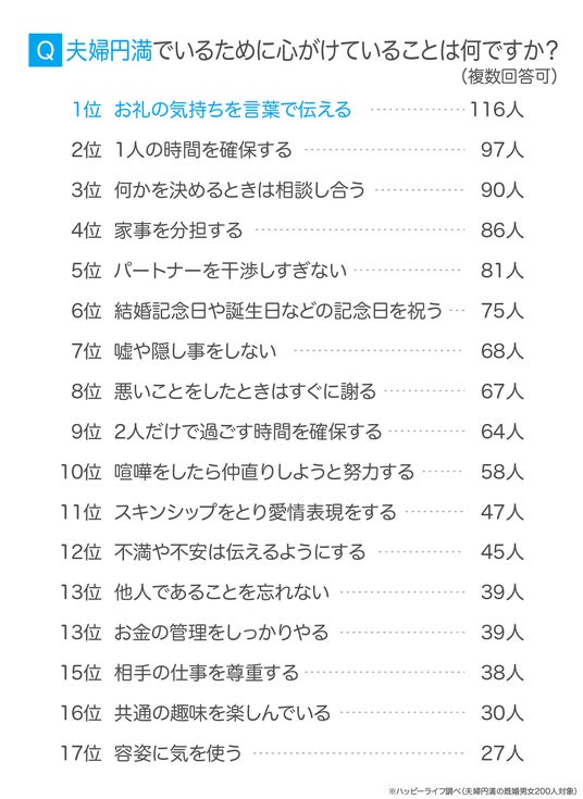 既婚男女200人に夫婦円満でいるために心がけていることを聞いたところ、最多回答は「お礼の気持ちを言葉で伝える」、次いで「1人の時間を確保する」、「何かを決めるときは相談し合う」の順番となりました。