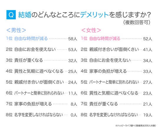 結婚のデメリットを聞いたところ、男女ともに「自由な時間が減る」が最多回答でした。