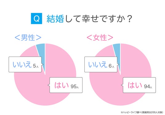 『結婚して幸せですか?』という質問に対して、「はい」と回答した男性は95人、女性は94人でした。