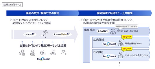 フリーランスコンサルタントと企業のマッチングプラットフォームである「ProConnect」と、自社のコンサルタントとフリーランスの専門性を掛け合わせた新たなDX/AIコンサルティングサービス「LeanX」の2つのサービスシリーズを展開しています。