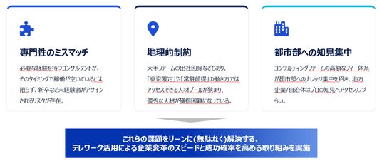 しかし、テレワークの活用により物理的・組織的な制約を排除し、日本中のプロフェッショナルが能力を発揮し続けられる環境を整えることで、案件に対して「最適な専門家」を配置する仕組みづくりを推進しています。