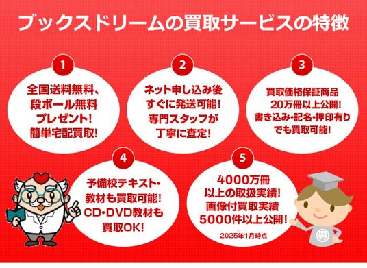 買取では、「学参プラザ(受験参考書・問題集・赤本・予備校テキスト・教材の専門買取店)」「専門書アカデミー(専門書・医学書・大学教科書・資格試験参考書・問題集・予備校テキスト・教材の専門買取店)」「メディカルマイスター(医学書・医療系書籍・予備校テキスト・教材の専門買取店)」の3サイトを展開しています。インターネットから申し込みをして宅配便の着払いで送るだけの簡単買取。全国から送料無料で買取可能。ご希望の方には段ボール無料送付サービスも行っています。