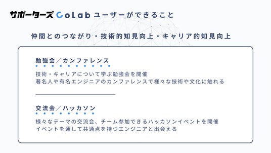 上記の背景を踏まえ、サポーターズは、社会人エンジニアに対して、キャリアを考え、技術を学ぶ機会を提供して参ります。今回新たに展開する「サポーターズCoLab」※では、サポーターズが約12年間の新卒エンジニアのキャリア支援で培ってきたノウハウを活かし、技術勉強会・カンファレンスや、交流会・ハッカソンなどを定期開催します。またキャリア支援の一環として転職を考えられているユーザー様向けに転職支援も実施します。
