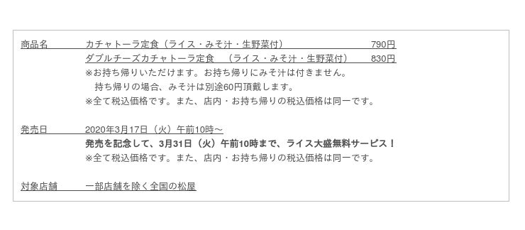 このたび松屋フーズ(本社:東京都武蔵野市、代表取締役社長:瓦葺一利)では、牛めし・カレー・定食・その他丼の「松屋」におきまして、2020年3月17日(火)午前10時より、「カチャトーラ定食」を新発売いたします。