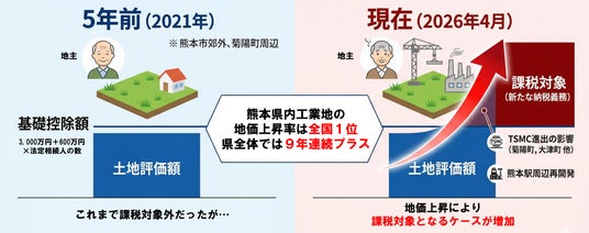 世界的な半導体企業・TSMCの進出等により、地価上昇率で全国上位を独占する熊本県。その恩恵の裏側で、「いつの間にか課税対象となった層」の増加や、今年4月に開始した相続登記の義務化などにより、地主や経営者層における適正な資産承継に向けた見直しが急務となっています。