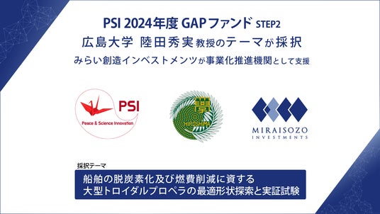 科学技術振興機構(JST)「大学発新産業創出基金スタートアップ・エコシステム共創プログラム」の採択プログラムのPeace & Science Innovation Ecosystem(PSI)「2024年度 PSI GAPファンドSTEP2」に国立大学法人広島大学(学長:越智光夫) 大学院先進理工系科学研究科 陸田 秀実 教授のテーマ「船舶の脱炭素化及び燃費削減に資する大型トロイダルプロペラの最適形状探索と実証試験」が採択されました。株式会社みらい創造インベストメンツ(代表取締役社長:岡田 祐之)は本テーマについて事業化推進機関として伴走し、技術の事業化、スタートアップ創業をめざします。