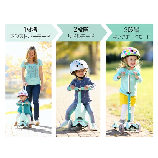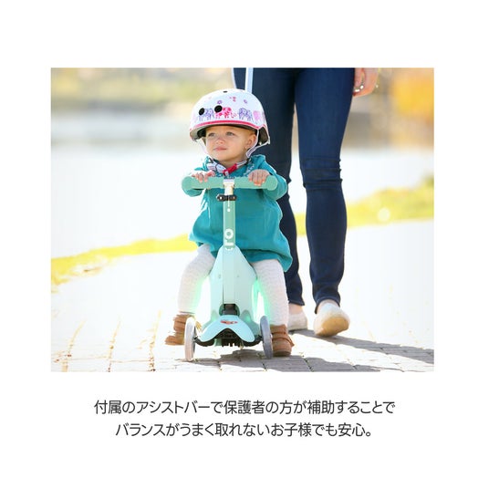 ミニトゥーゴー デラックス プラス LEDは16か月から5歳まで乗れる1台3役のキックボードであり、子供の成長によって長くお使い頂けるため、お子様に大人気の商品です。16か月からはアシストバーを装着してお子様のバランス補助ができ、20か月からはサドル付きモードで自律神経を刺激する事ができます。またサドルを外してキックボードモードで乗ることができるため、遊びながら自然にバランス感覚を養うことができます。