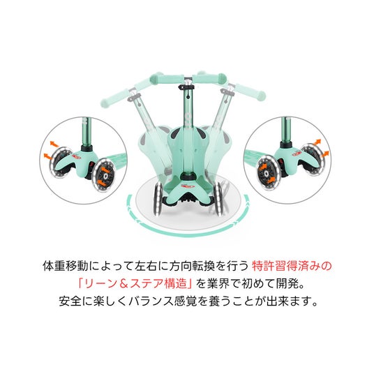 特に今回新発売されたミニトゥーゴー デラックス プラス LEDの新色は、T-barがキックボード本体と同じミントとピンク色にアップグレードされた為、もっとカラフルに!もっと楽しく!乗ることができる仕様となっております。外出やお出かけの際もベビーカー替わりに活用できるため、ママたちにも好評を得ております。体重移動によって左右に方向転換を行う、特許習得済みの「リーン&ステア構造」を業界で初めて開発し、安全に楽しくバランス感覚を養う事が出来るため、入学プレゼントや誕生日プレゼントとして人気を得ております。