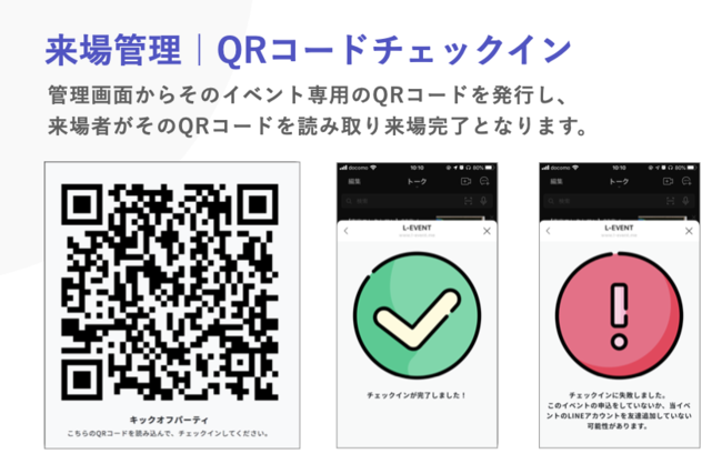 イベント当日、管理画面から開催するイベントに対応したQRコードを発行します。そのQRコードを受付で参加者が読み取ることで、その人がこのイベントに参加申込済みかどうか判定することができます。