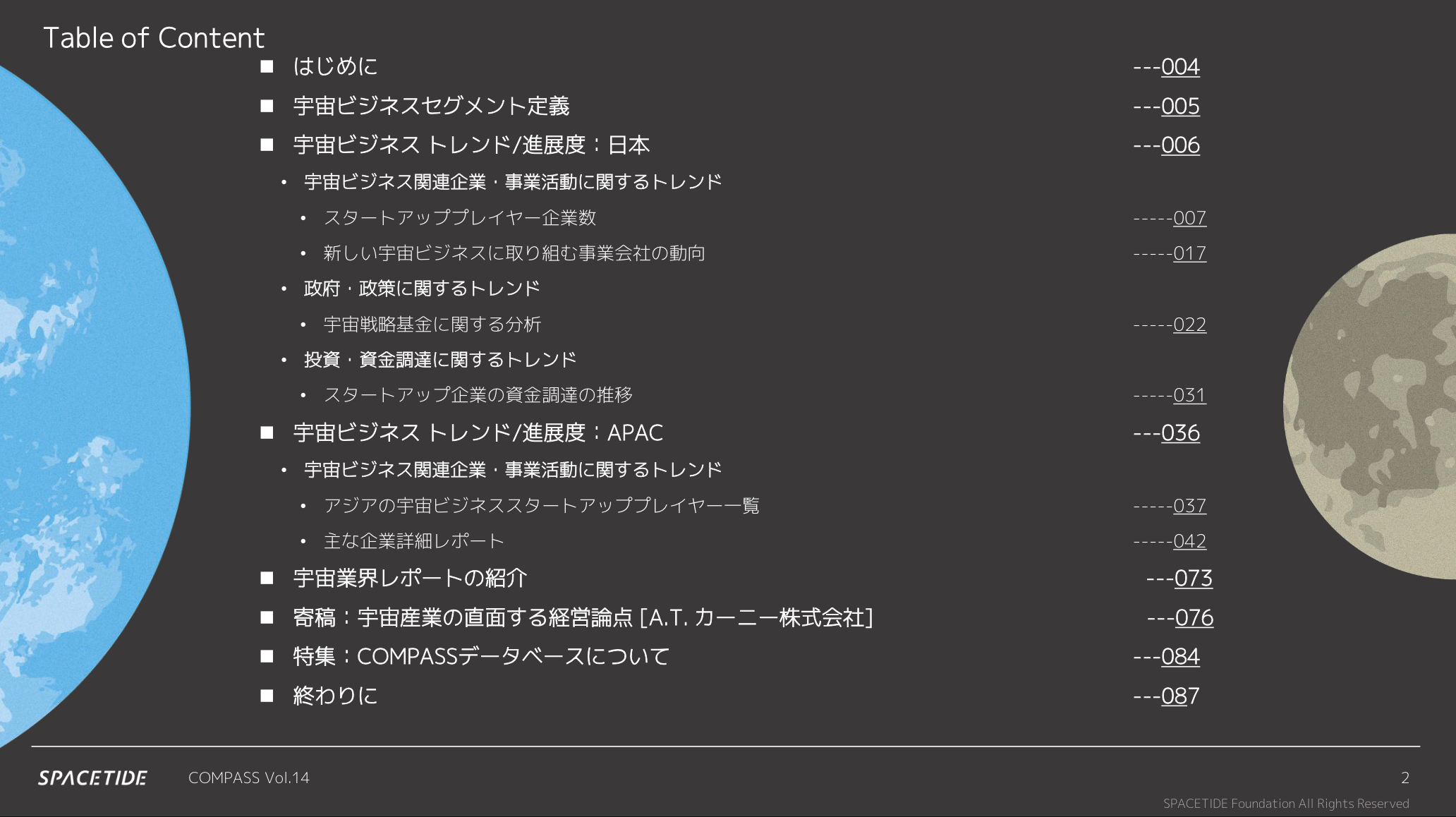 一般社団法人SPACETIDE(所在地:東京都港区、代表理事兼CEO:石田真康、以下「SPACETIDE」)は、2026年4月16日に、宇宙ビジネスに関する理解・興味を深め、情報を活用いただくための業界レポート「SPACETIDE COMPASS vol.14」を発刊しました。