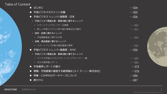 Vol.14では、国内114社、アジア323社にのぼる宇宙スタートアップの動向や資金調達指数の更新に加え、日本の宇宙政策の中核である「宇宙戦略基金」における異業種企業の採択状況を詳細に分析しています。 さらに、SPACETIDEのナレッジパートナーである経営コンサルティング大手A.T. カーニー株式会社(以下「A.T. カーニー」)による、宇宙産業が直面する複雑な経営課題を解き明かす特別寄稿を掲載しています。