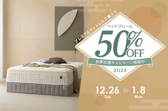 キャンペーン期間中に、ZINUS公式サイトでプレミアムマットレス( https://zinus.jp/collections/campaign )をお買い上げのお客様を対象に、ベッドフレームを50%OFFでお買い求めいただけるキャンペーンになります。