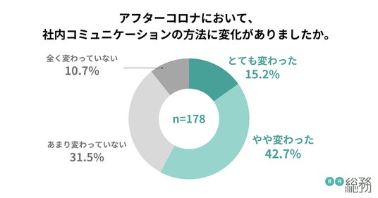 アフターコロナにおいて、社内コミュニケーションの方法に変化があったか尋ねたところ、約6割が変わったと回答しました(n=178)。